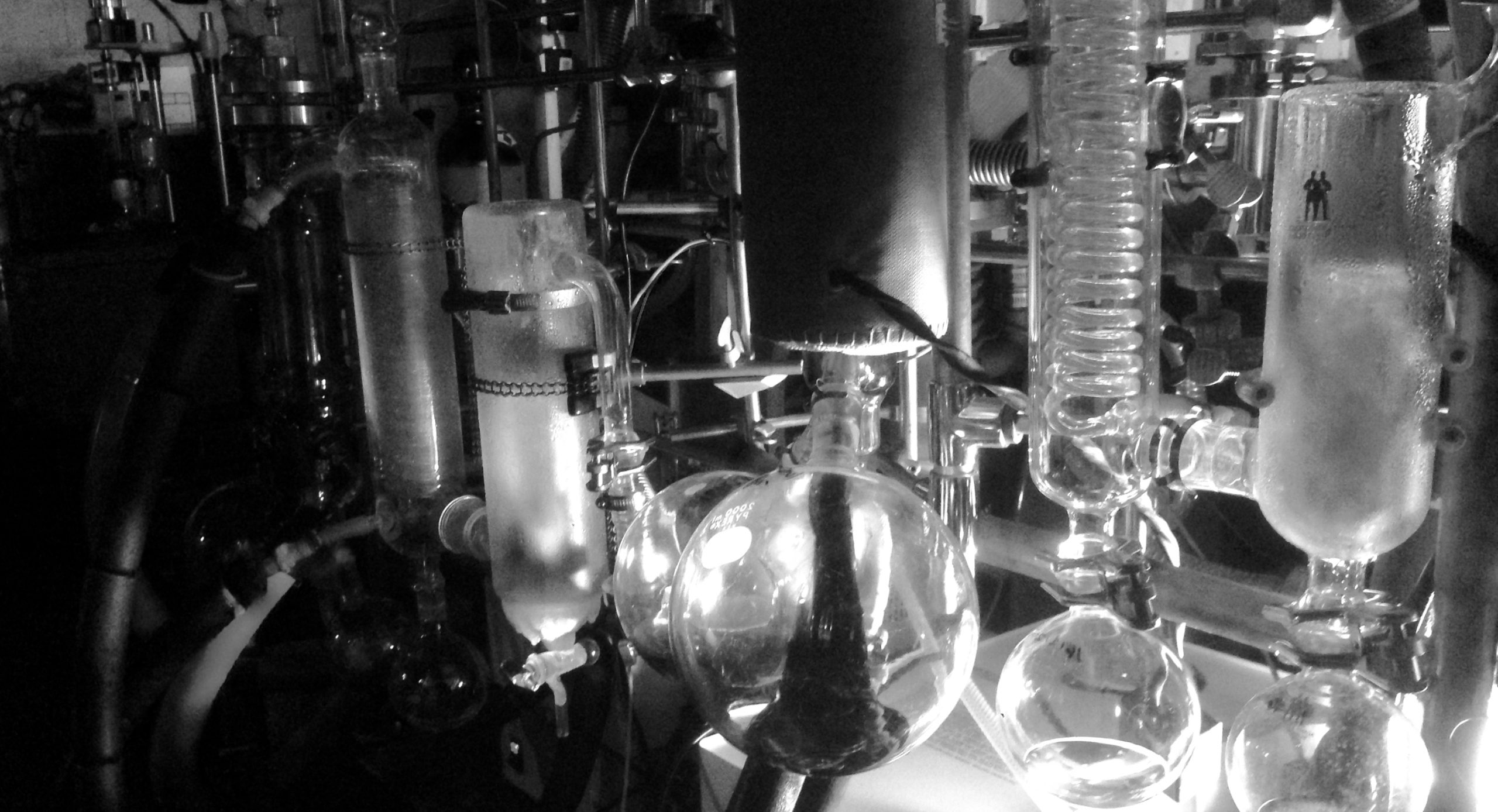 A dual wiped-film distillation set-up consisting of the main body of a 1970’s POPE a Heruis body, and modern, custom Adams&Chittenden glass parts. With triple cold traps and a single vacuum manifold with valves to separate the the flow from each still.